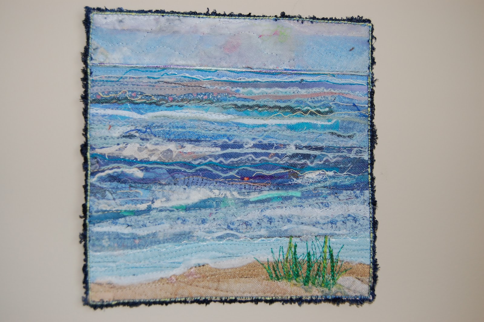 The colors are just beautiful and look at the details of the beach grass captured so well. I was able to watch her work earlier when she had an opening at Good Goods in Saugatuck, MI and loved watching her put these together . The color choice and change in value at just the right time captures the essence of the water and waves.
