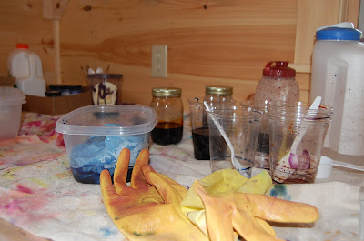 The kids were settling down and playing darts in the garage so I decided to start dyeing fabric in the barn when I saw the sun starting to peek out this afternoon. I picked a few colors I had purchased smaller samples of at the Quilt Festival on Saturday-butterscotch, eggplant, teal blue, nickel and then one color that was just a mix of old dyes I had. I thought I would just start out with about ten yards for today.