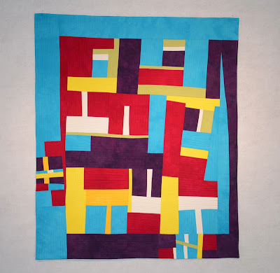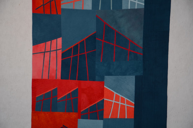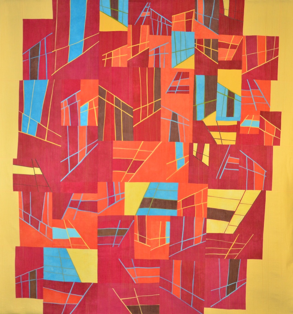 My composition, Rooflines # 6 , is a contemporary art quilt. This Rooflines series celebrates my fascination with the architecture of the Frederik Meijer Gardens here in Grand Rapids. The steel beams juxtaposed with the glass windows against the sky and the varying colors of nature contained within the conservatory building provide for a rich study of line, color and shape. I have utilized my hand dyed fabrics as my paint and the free hand cutting of shapes and lines to create this piece. Dense machine quilting adds texture and another dimension for the viewer.