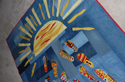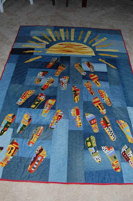 Well, I finally have my first finish of 2010. The recycled jean quilt is dones-completely done-to the trimming of the loose threads and placing of the label. Other than delivering it , there is nothing more to do to it. I never thought you could be traumatized by a quilt but it happened. It took a month longer than I thought it would-ok maybe three weeks longer. It’s done and I am singing and dancing a little happy dance. And you can too because the best thing is-you don’t have to hear me complain about finishing it ever again. I am ok with it and what’s important is that my son likes it and it’s for his class. So in the end -That’s all that matters!