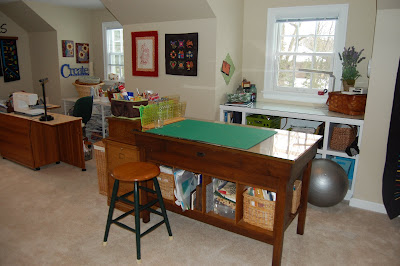 We moved here four years ago and ended up doing a whole renovation on this house. Not really planned but done at this point. The room over the garages was drywalled and while I was gone to Vermont the first year, my husband had it carpeted for me-awfully sweet guy but I was kind of taking over the house with my art. As time went on, I have added shelving and the room is better than I ever dreamed of. I can leave many projects in process out and close the door when I am done for the day. No more clearing off the kitchen table at dinner time!