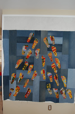 I sewed yesterday until I could sew no more. I finished stitching around all thirty feet for my little auction quilt. I am not sure when I have been so happy- I was just dreading it. Now I must go to get the backing fabric. I will use batting too-someone asked me if I would and after checking with others who have used recycled jeans they have said it does work. I am worried about the bulk…but not dreading it as much as the tedious stitching around each foot-now done!
