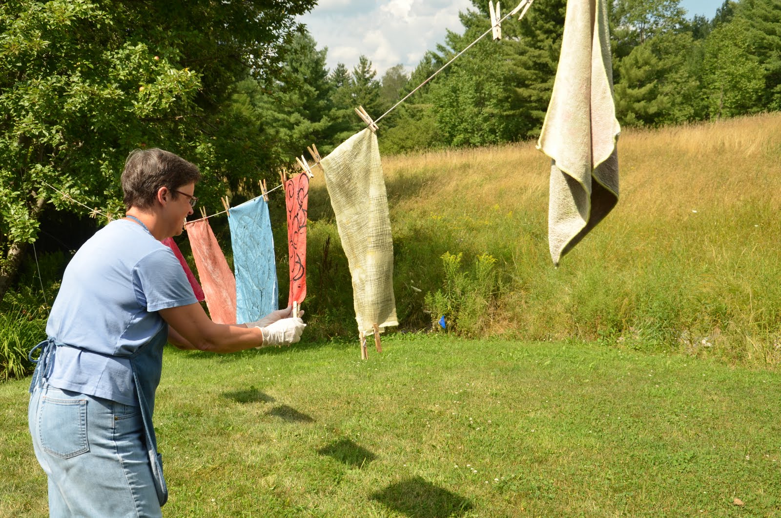 I have finished fabric dyeing for the summer of 2011. Oh,what a great feeling that is to say! At least until I get home from Vermont , unpack and sort it all and see what I didn’t dye to fill out my stash. So, I will feel absolutely amazing and kind of like superwoman -until I get home. I think the final count is 250 yards since May-craziness.